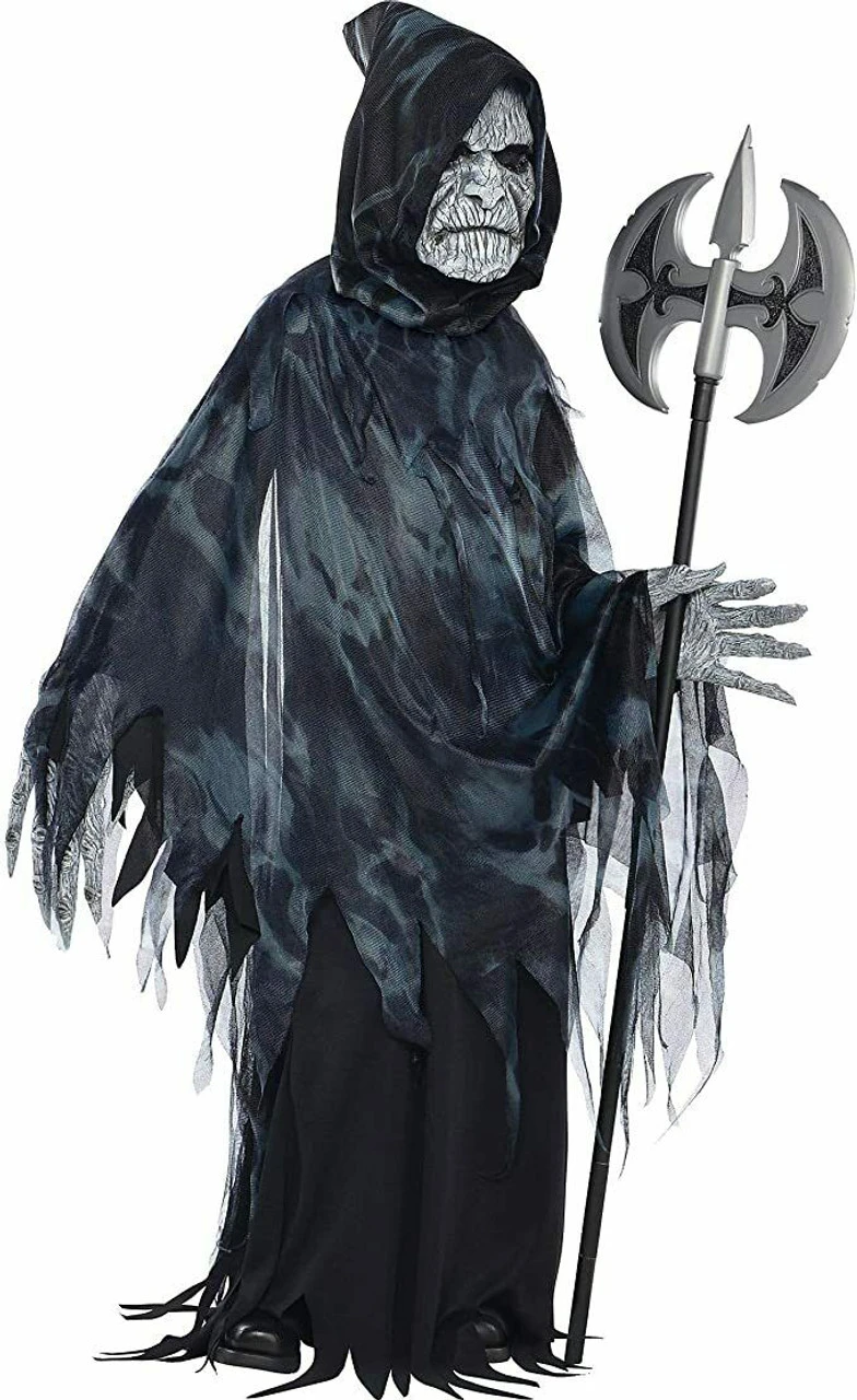 Black tunic and an attached matching hood and cloak, molded latex mask and gloves with exaggerated finger length