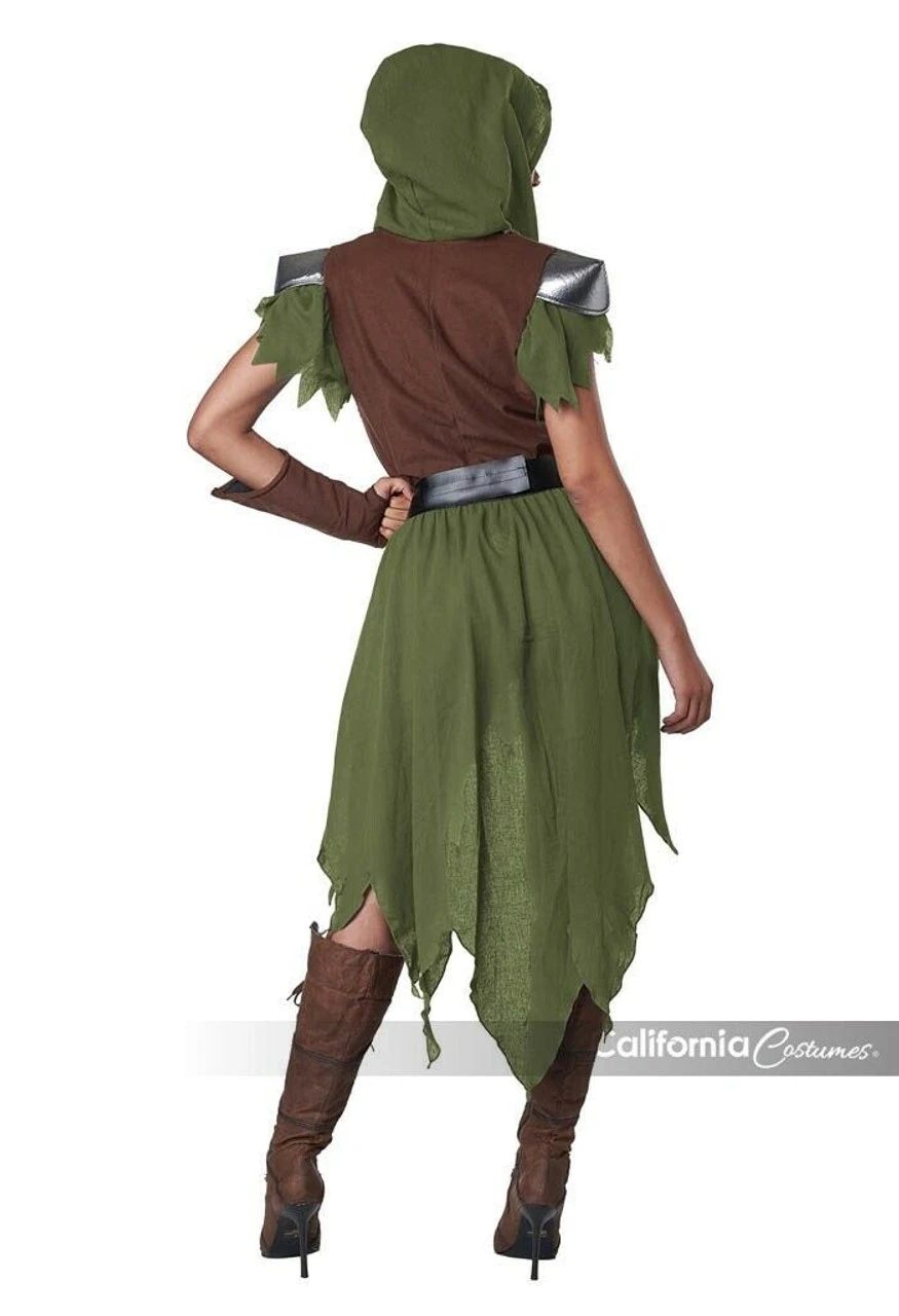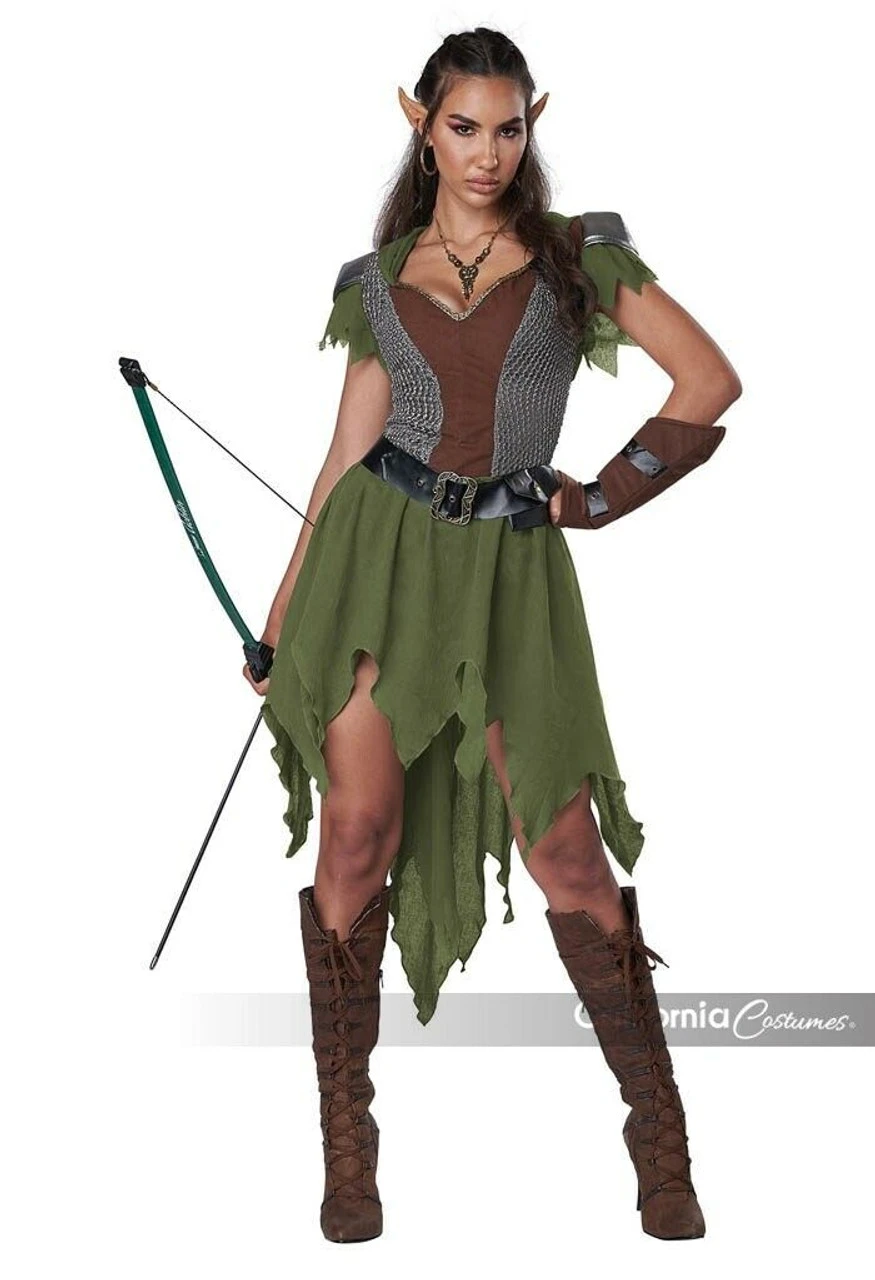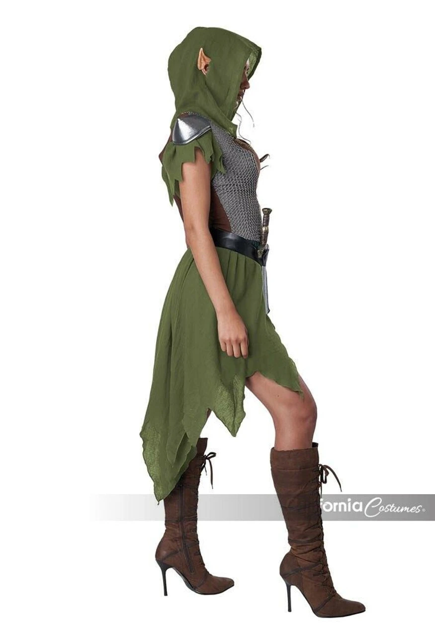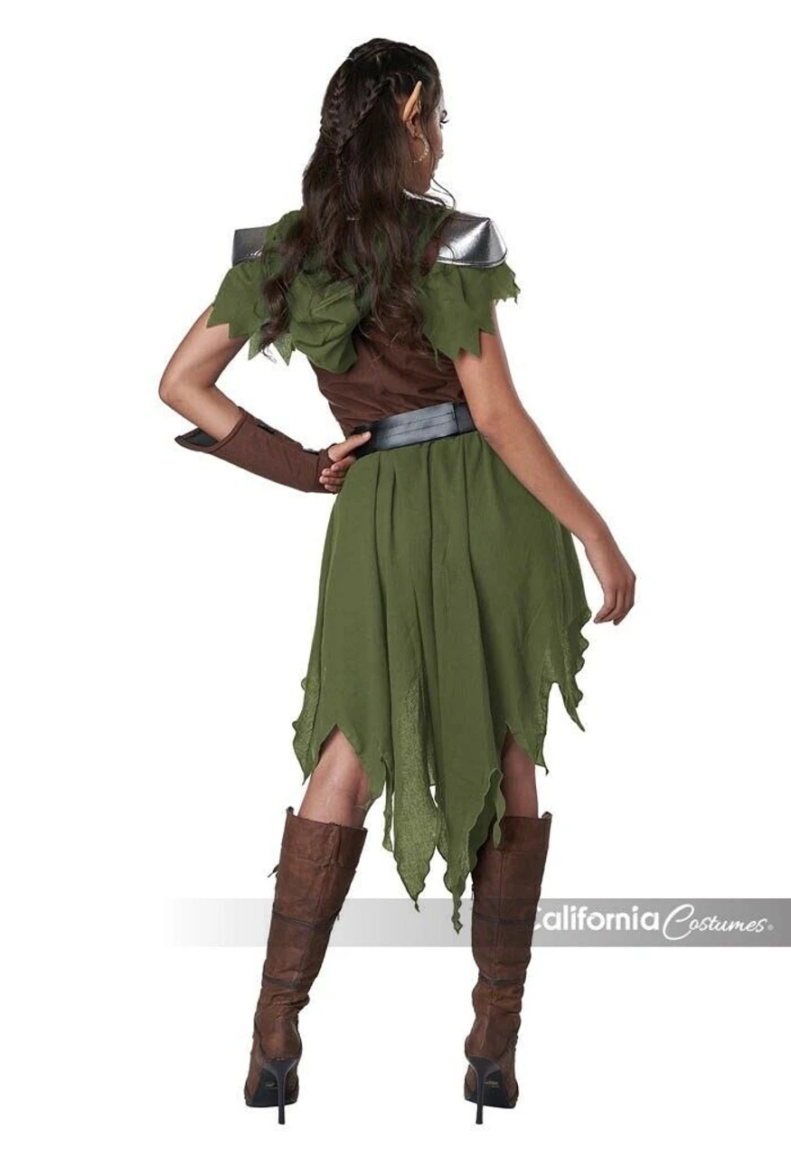 Product Description: I defend my people of the forest. The Elven archer costume is a dress with attached hood. It features an attached metallic knit trim, shoulder pads and a high low skirt. Costume also includes a belt with decorative buckle and attached coin purse and 1 forearm cover.
