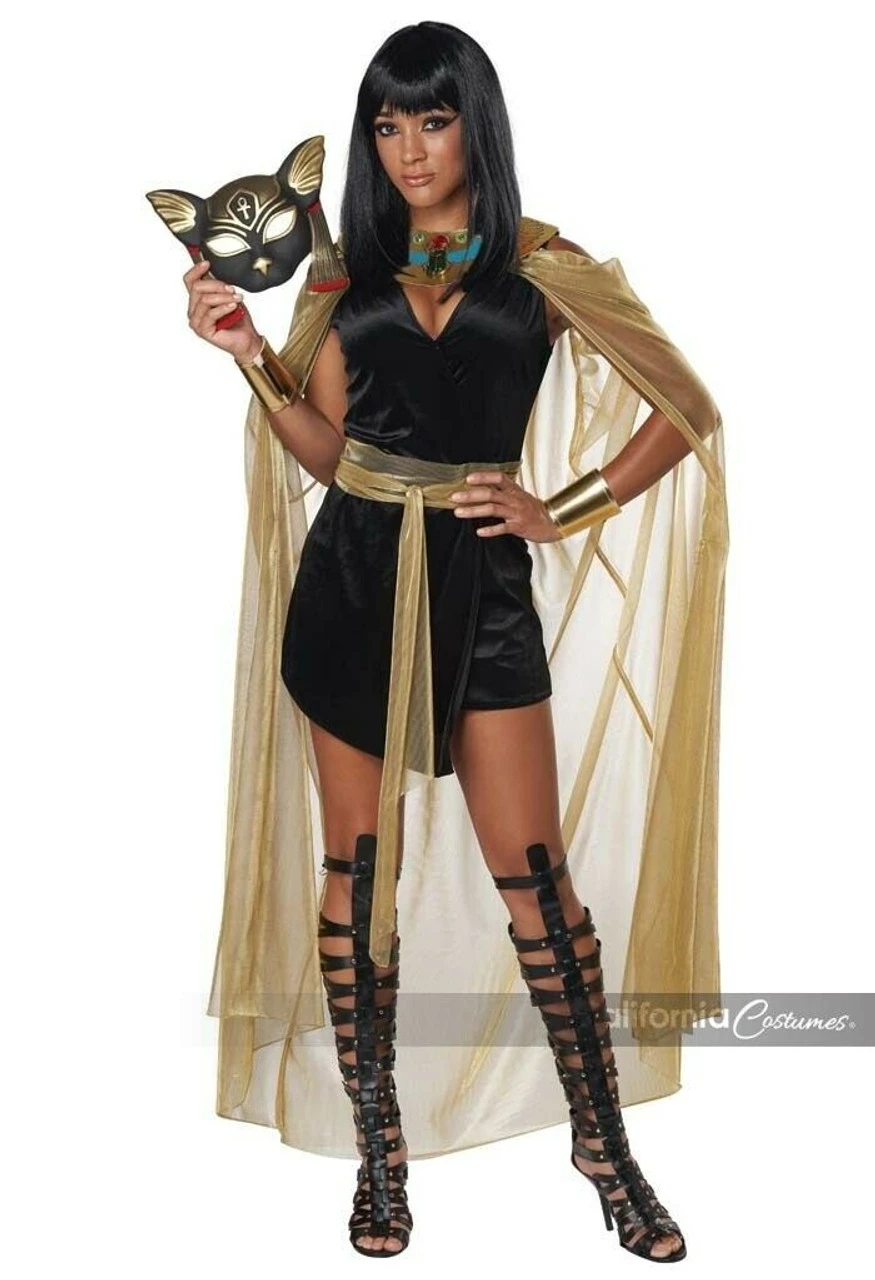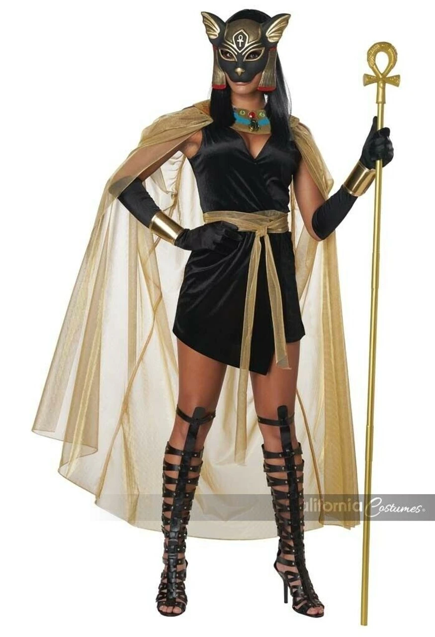Product Description: A divine protector of women, the Feline Goddess costume is based on the ancient Egyptian goddess Bastet. Costume comes with a black wrap dress, a gem decorated collar with attached golden mesh cape, a gold mesh belt tie, 2 wrist cuffs and a character mask.