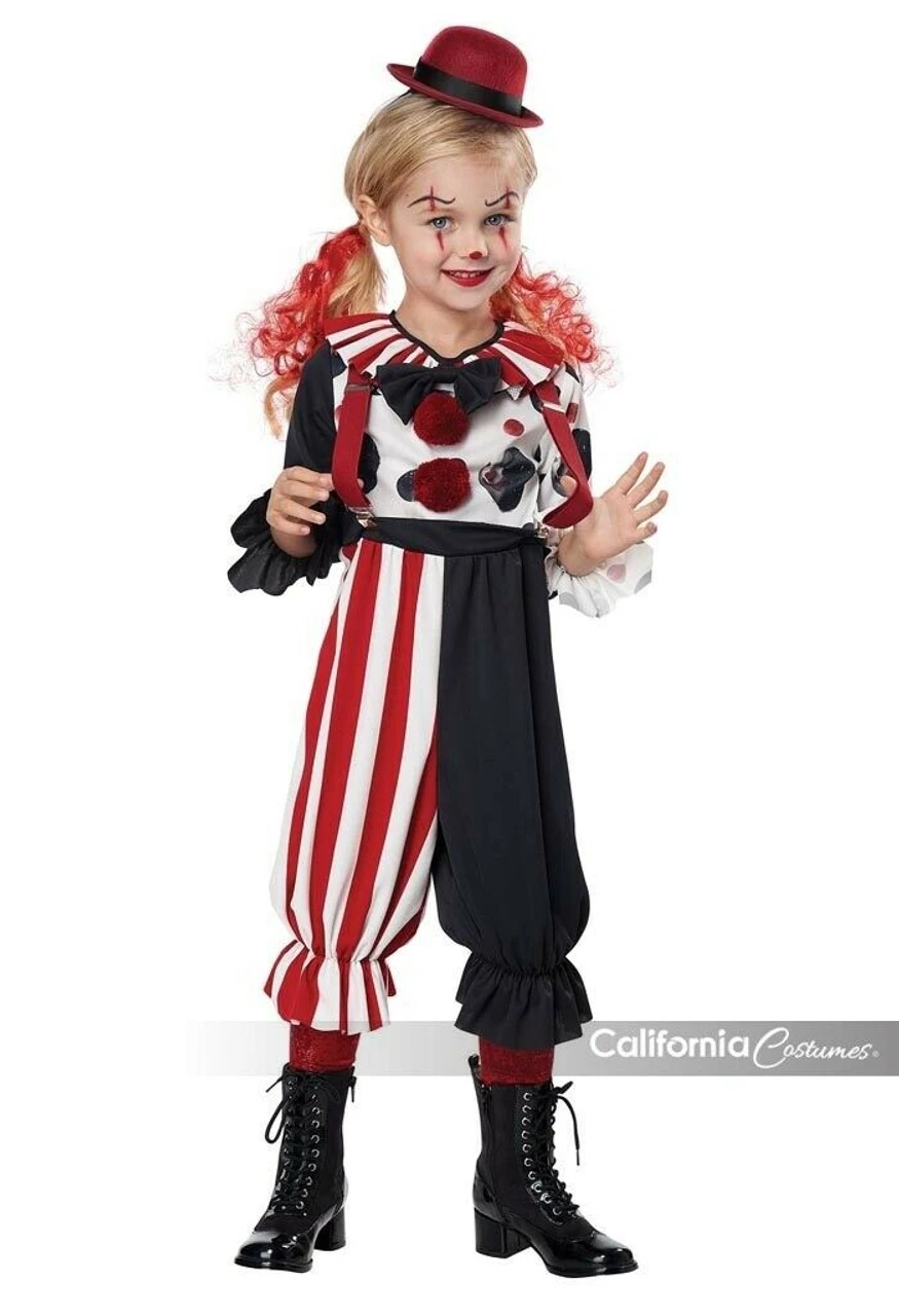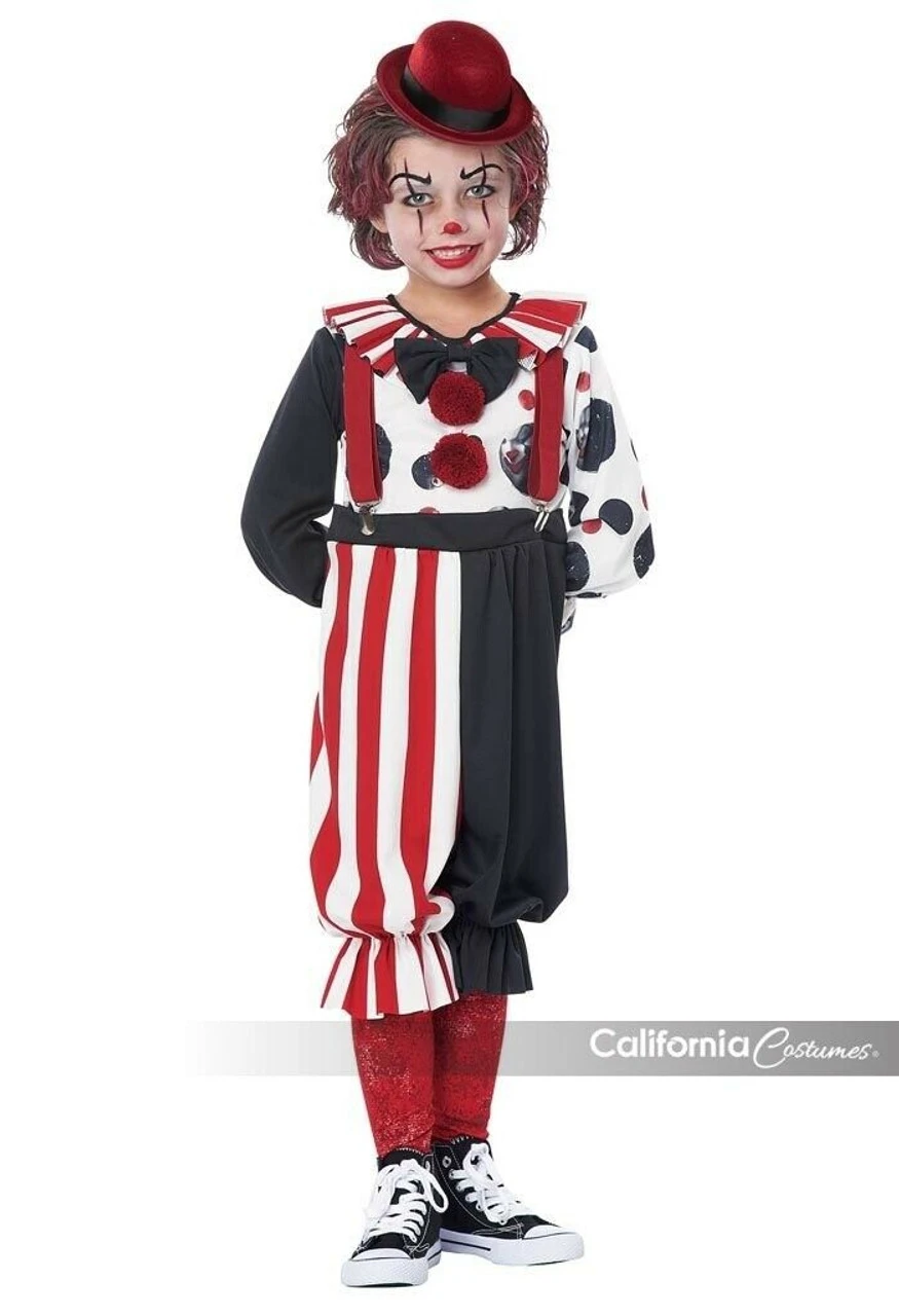 Product Description: Come laugh together forever and ever. The Kreepy Klown Kid toddler costume is a mix patterned shirt with two attached poms and an attached collar. It includes a pair of pants, bow tie, a pair of suspenders, a hat with plastic headband and a pair of red socks.