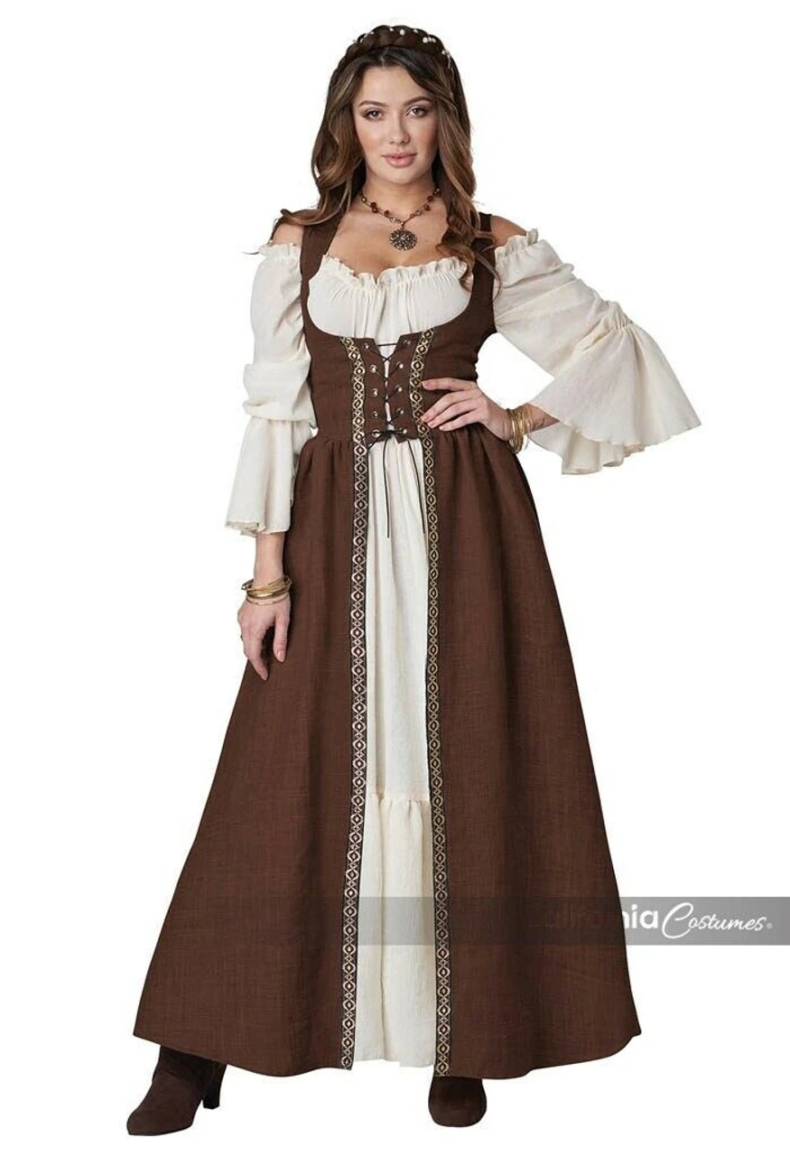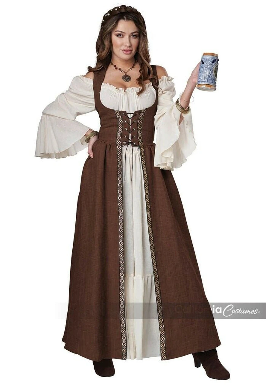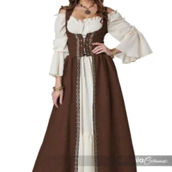 Product Description: This one piece overdress in brown features a lace up bodice and attached lapel collar. Pair it with your own dress or under dress to create your own medieval outfit.
