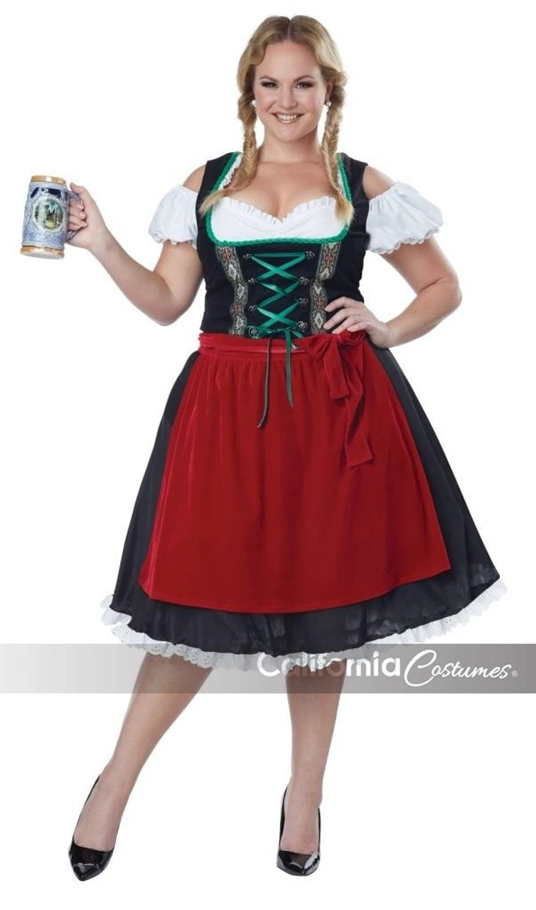 Prost! Based on traditional German dirndl dresses, the Oktoberfest Fraulein costume features a corset styled dress with an attached white shirt top. It also comes with an apron and pettiskirt. Not included: beer stein/mug, jewelry, shoes.