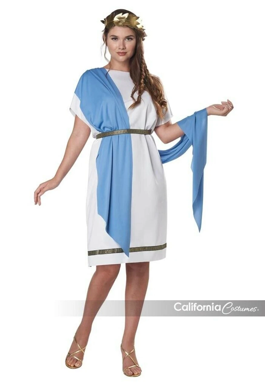 Product Description: A good time for togas. Costume includes a tunic top, a belt, 2 shoulder shawls choices in red and blue and a gold leaf elastic headband.