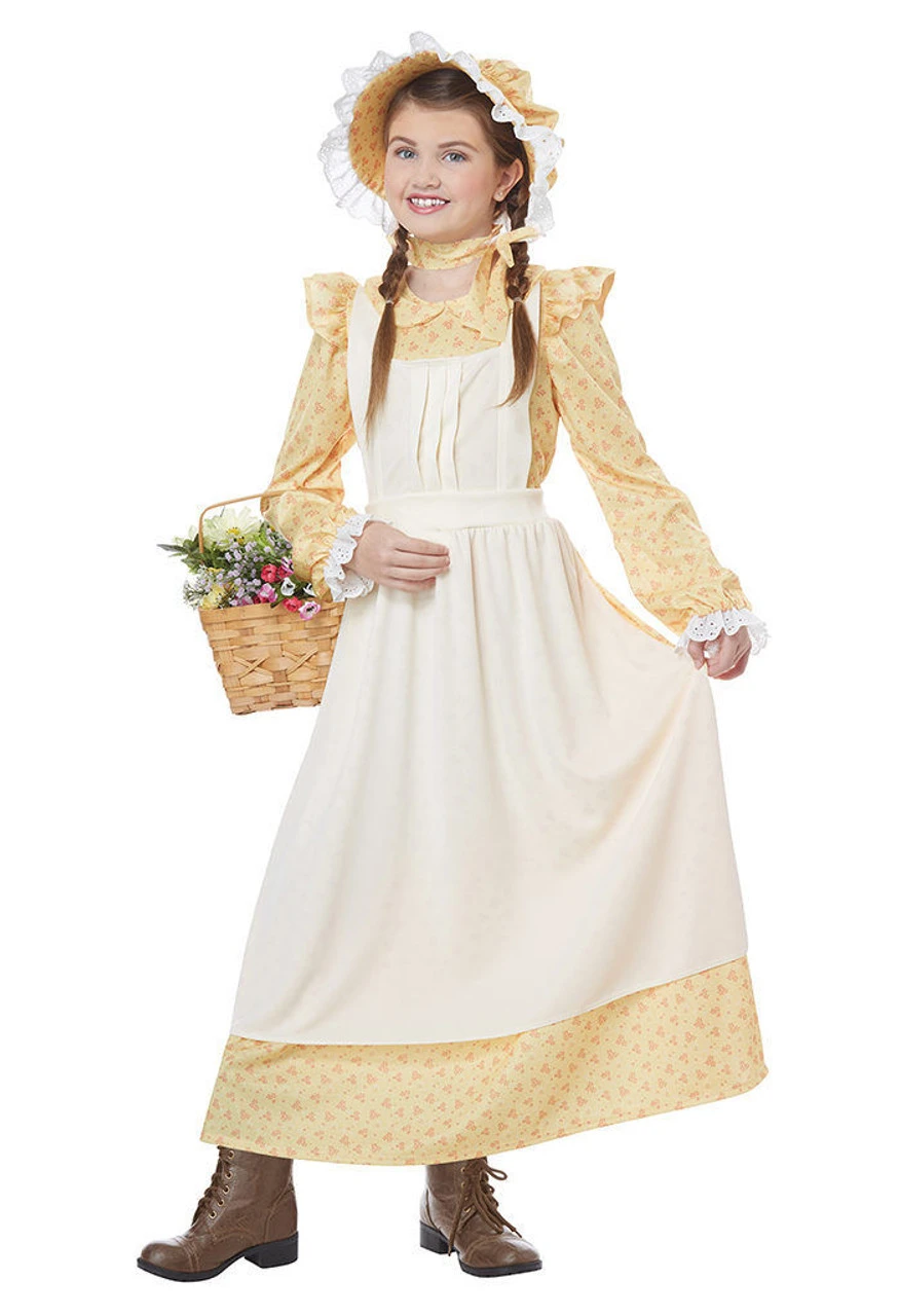 Product Description: A 19th century dress style worn by the adventurous pioneers and homesteaders of the American western frontier. The Prairie Girl child costume is a long yellow pinafore dress with the apron attached. It comes with a bonnet cap.