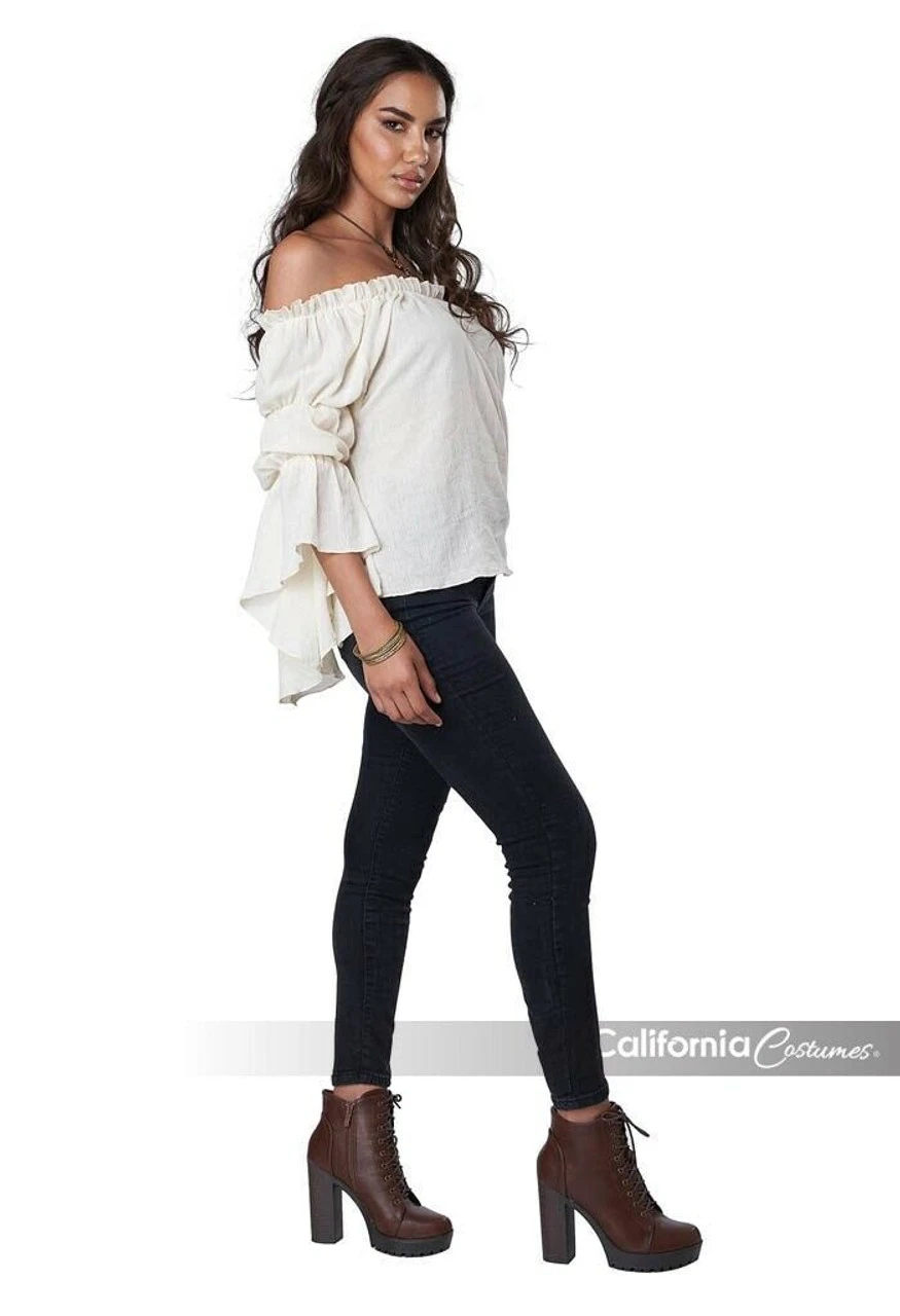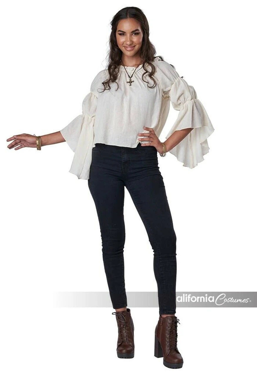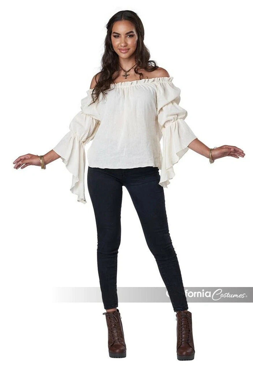 Product Description: The Renaissance Peasant Blouse is a cream colored top with ruched sleeves. It features an elastic neckline and is made of a fabric with a medium coarse looking texture weave.