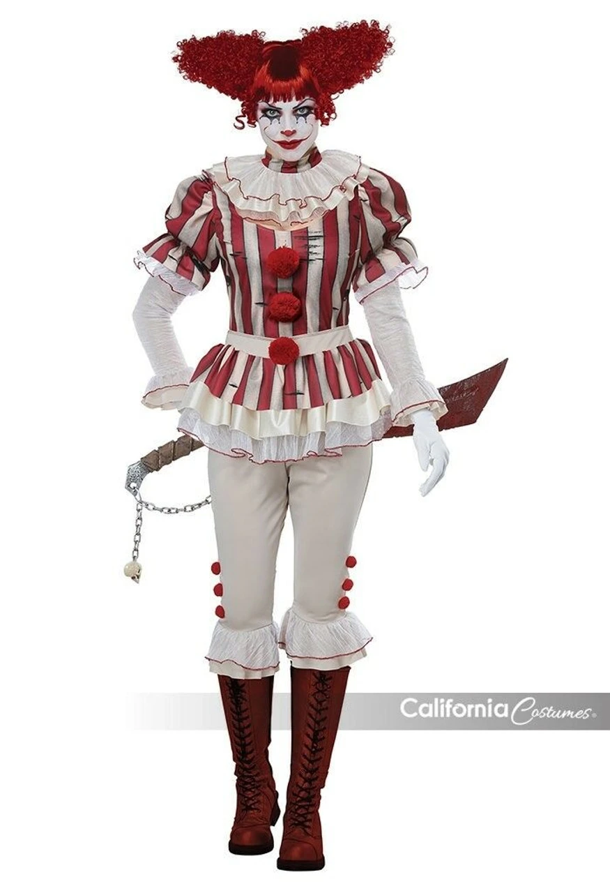 Product Description: Are you afraid of clowns? The Sadistic Clown costume features a printed top with puffed shoulders and sleeves with a ruched mesh layering. It also includes a layered short skirt, a pair of ruffle trimmed pants and a layered ruffled collar.