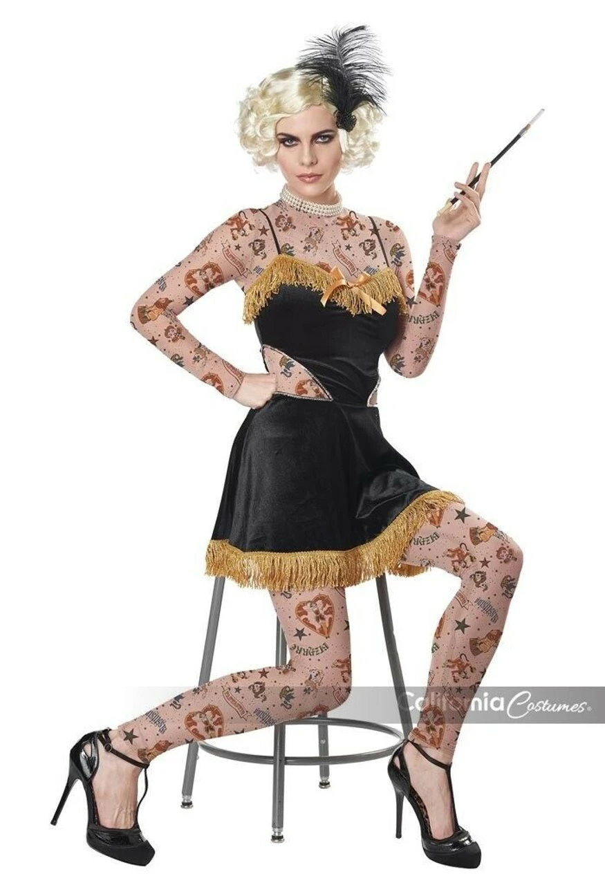 Product Description: She is inked and incredible. The Amazing Tattooed Lady costume includes a black dress with gold fringe trim and a stretch fit mesh body suit with tattoo print.