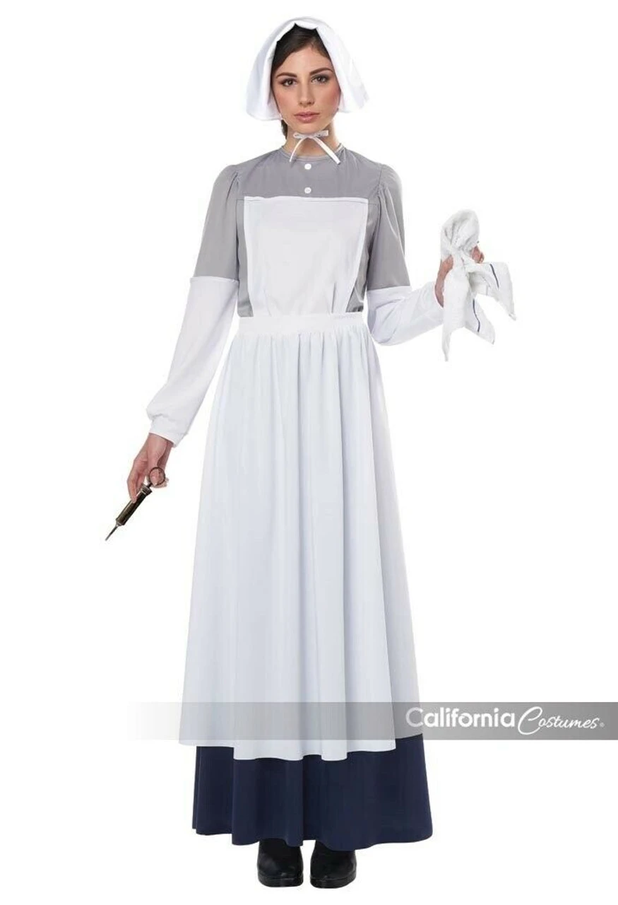 Product Description: During the Civil War many valiant women volunteered to be nurses at field hospitals. The War Nurse costume comes with dress with bib styling, a skirt apron and a bonnet cape.