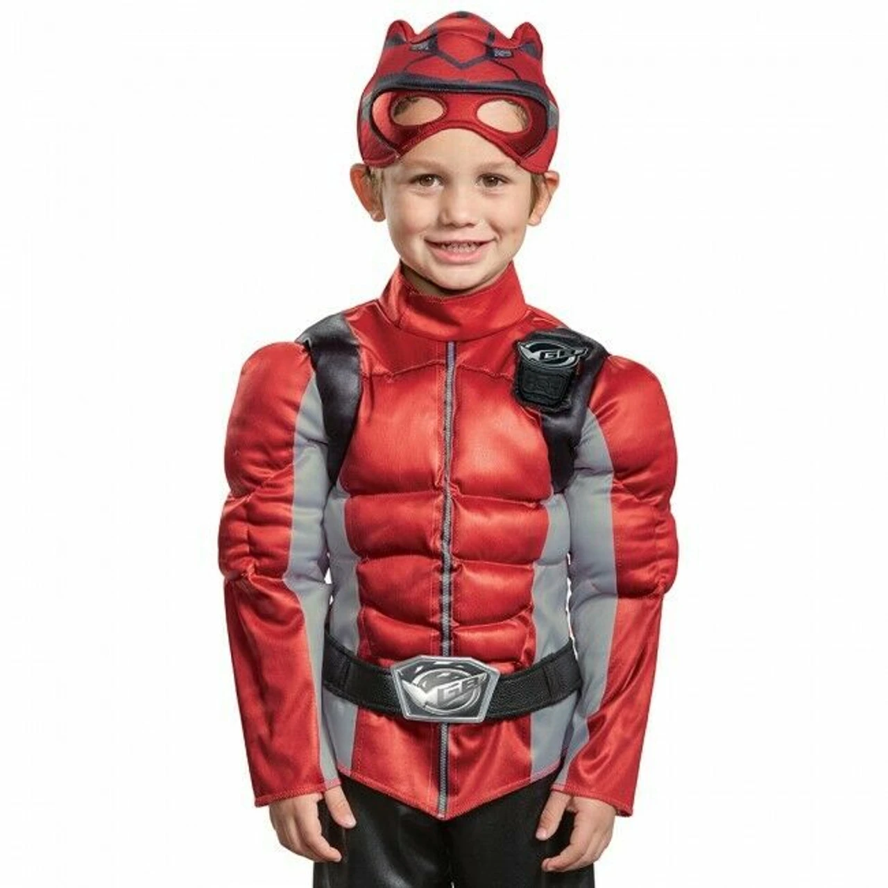 Jumpsuit with muscle torso and arms, attached belt and soft character headpiece.