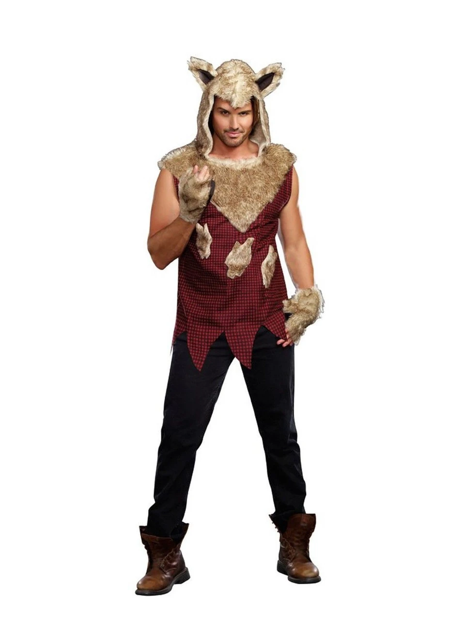 -This big bad wolf costume for men includes a tunic with faux fur hood & fingerless gloves