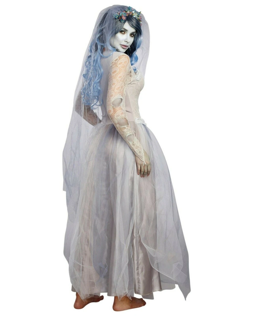 This zombie bride costume features a gray tattered gown with ribcage screen print, underwire bodice, skull lace sleeves, and full tulle and satin skirt.