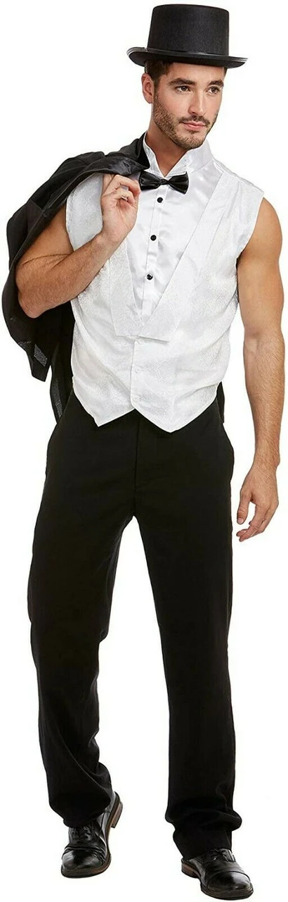 Includes satin jacquard 1920s swoop vest with attached shirtfront, bow tie, and collar