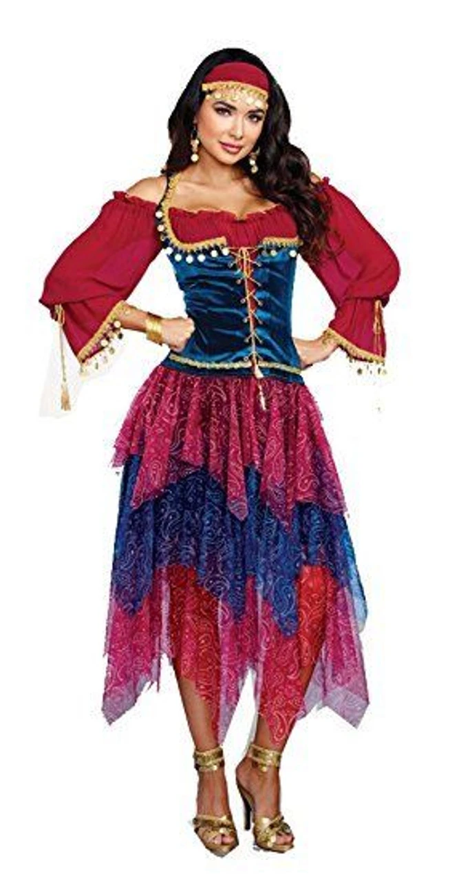 Stare into her crystal ball to find out what your future has in store. This gypsy costume features a peasant-style dress with velvet lace-up bodice, gold trim, multi-tiered handkerchief skirt with paisley print and gold coin detailing. Includes matching head wrap with gold coin trim. (Jewelry not included.) (two-piece set)