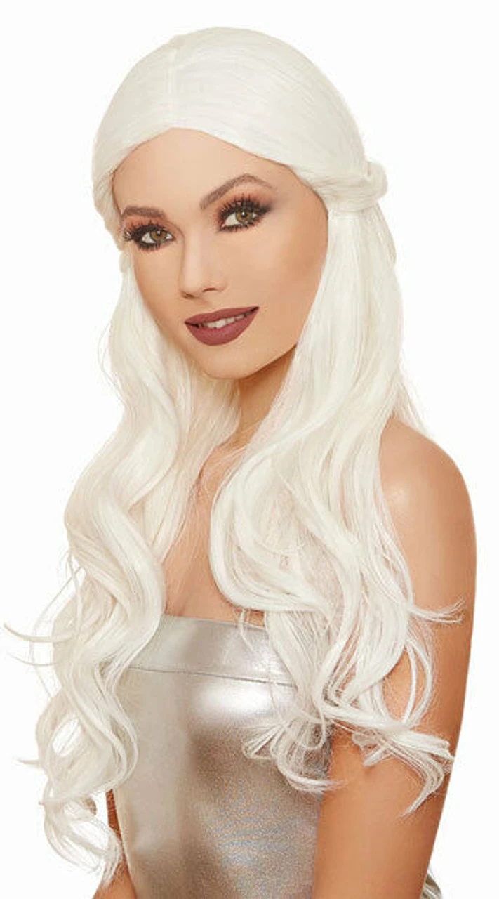 Change up your appearance with this striking white wig featuring a center part, a pulled back style with a twist, and a long wavy style.