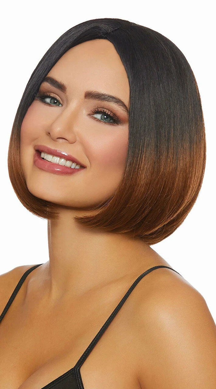 Switch up your look with this cute wig featuring a dark brown to light brown ombre, a center part, and a short, blunt bob style.