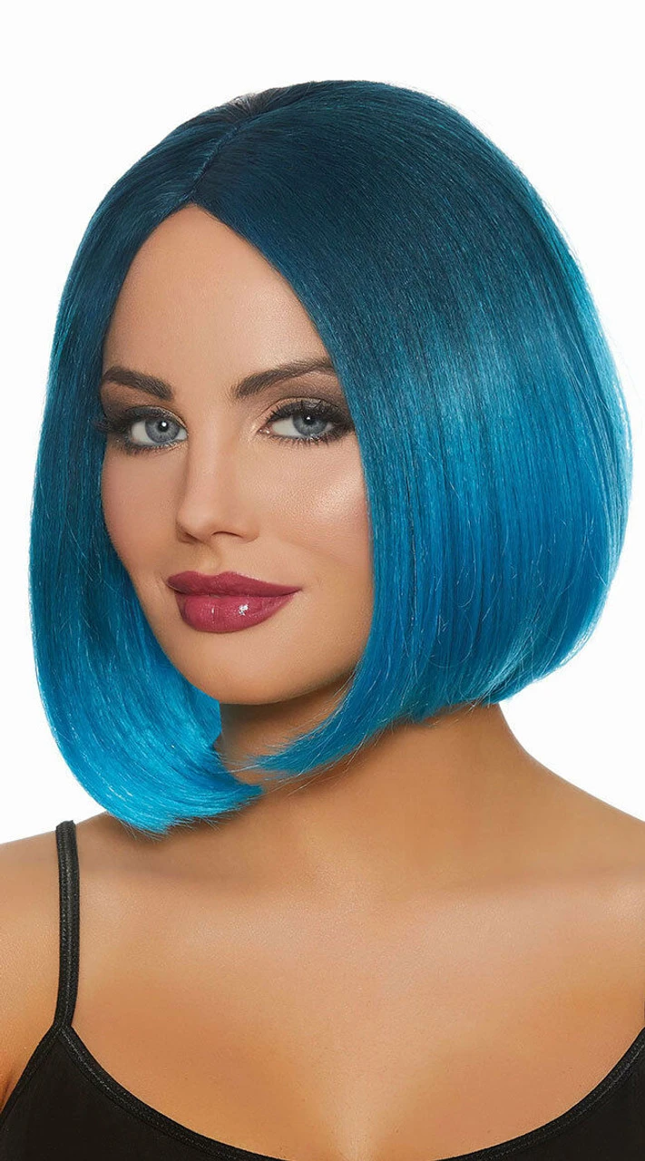 Switch up your look with this cute wig featuring a dark blue to light blue ombre, a center part, and a short, blunt bob style.