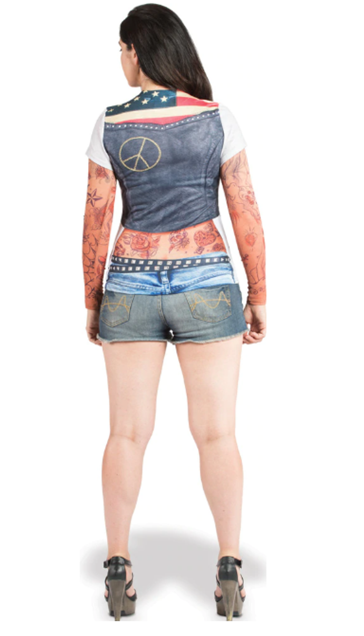 The Faux Real Ladies Tattoo with Mesh Sleeves is the ultimate way to get the tattoo covered biker look, and is as easy as putting on a t-shirt! This shirt features a realistic looking leather vest with various patches, and an awesome American flag on the back, along with a huge assortment of tattoos on the arms and body. This shirt is an awesome choice for costumes, gag gifts, and wearing out when you’re looking to grab some attention wherever you go.