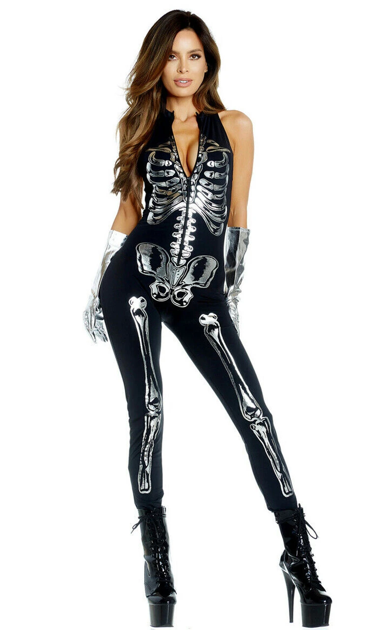 Shine from the inside out this Halloween when you look sultry and spooky in our Flashy On The Inside Sexy Skeleton Costume. The sleeveless mock neck jumpsuit is detailed with metallic bone screen print in the front and back.