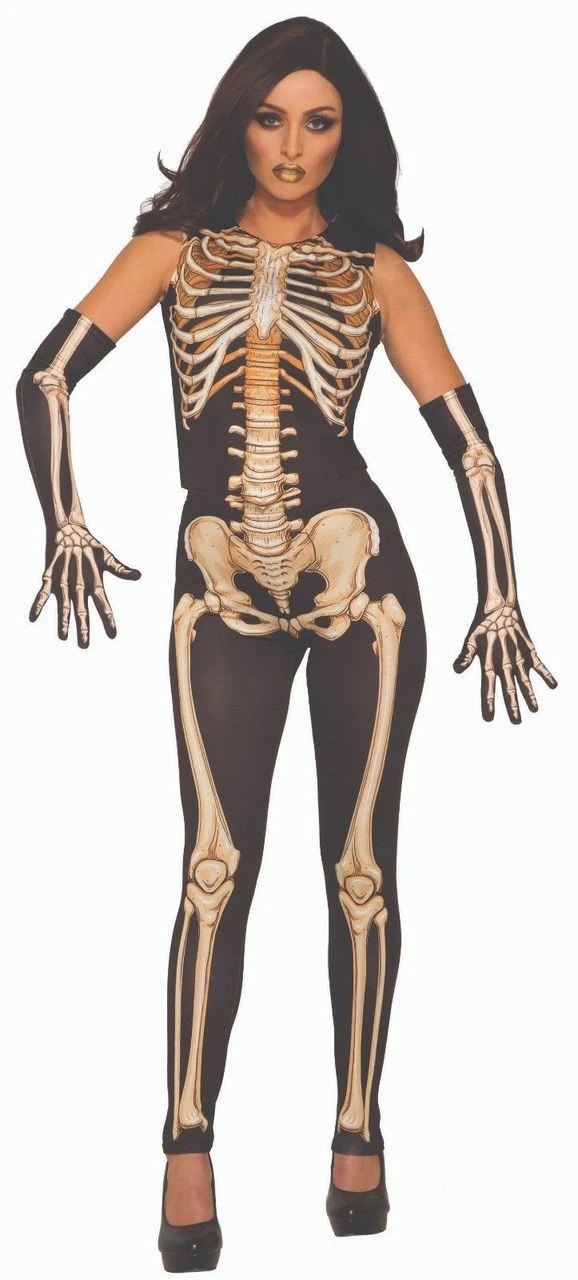Step out this Halloween in skeleton fashion! 100% polyester costume consists of a sleeveless shirt, long gloves, and pants. Each piece of black clothing comes with skeleton bones printed on the front and back. Available in one women’s size: up to a size 12. Ideal for Halloween parties, events, dances, and more! Made by Forum Novelties, a leader in costumes and novelty products for more than 30 years.Â