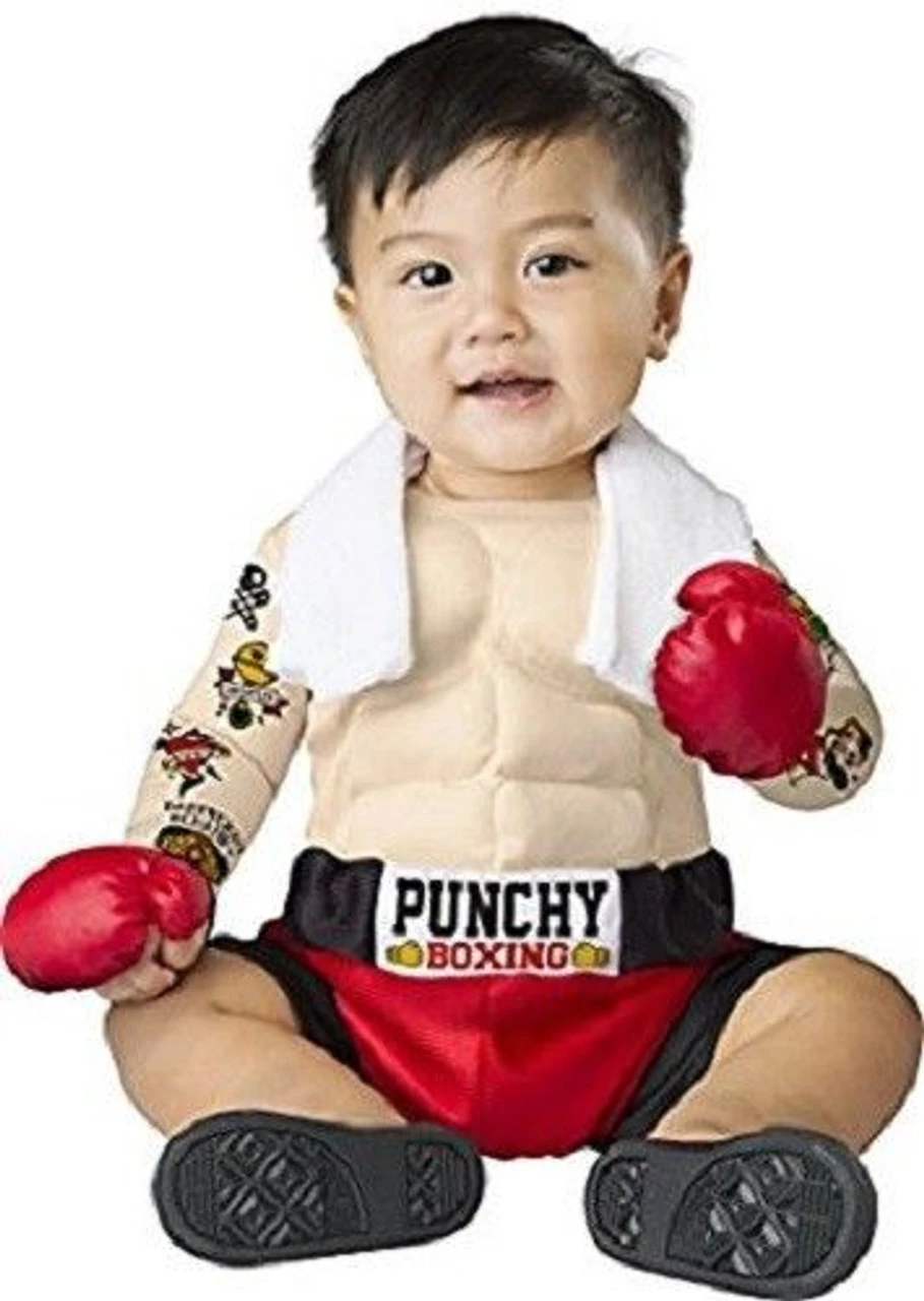 This lil’ fighter has cuteness in his corner! A detachable towel covers an adorable muscle jumpsuit with cleverly tattooed arms. His sewn-on boxing gloves with matching shorts make this contender the sweetest thing in the ring!