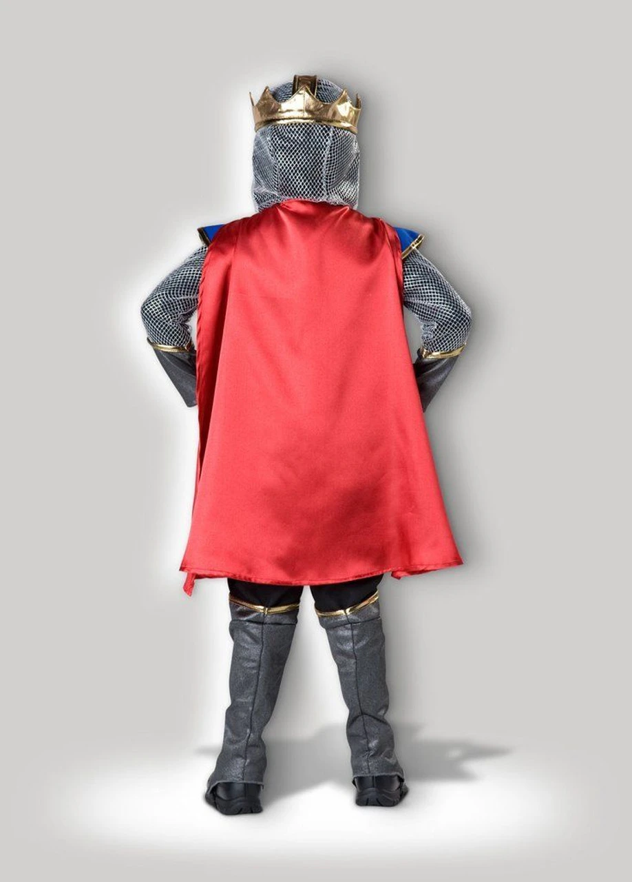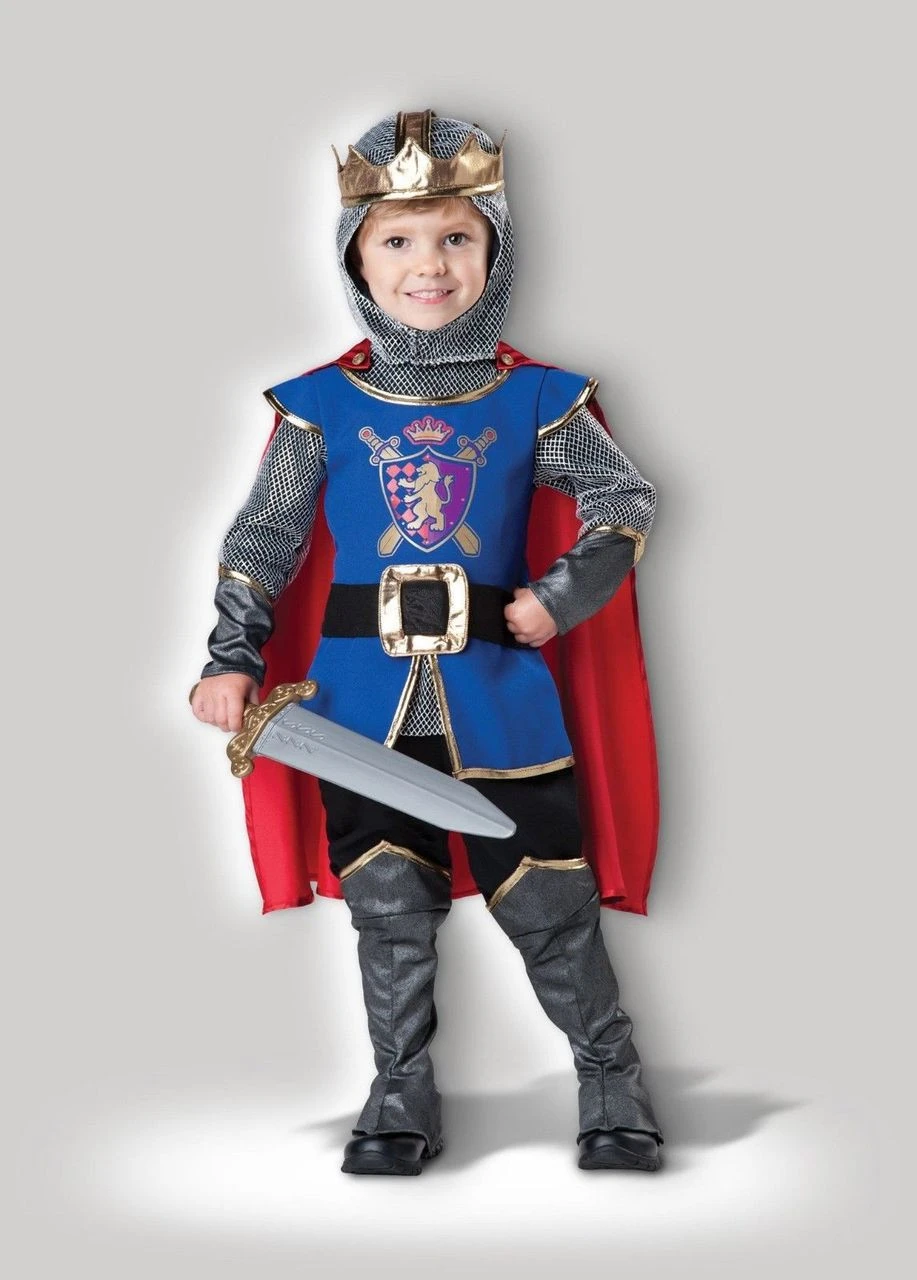 Your knight in shining armor will be ready to fight dragons and guard the king in this faux chainmail jumpsuit, gold trimmed boot covers and detachable satin cape.
