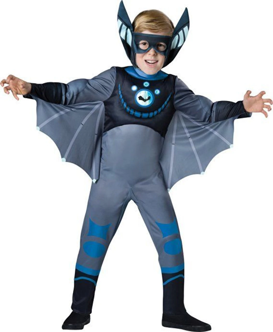 Fly through the sky with the Kratt Brothers in our boys bat costume! This Wild Kratts bat costume features a gray jumpsuit with Blue detailing. Spread your arms to show off the attached bat wings! Strap on the comfortable foam mask to complete your bat creature power suit. Shoes not included.
