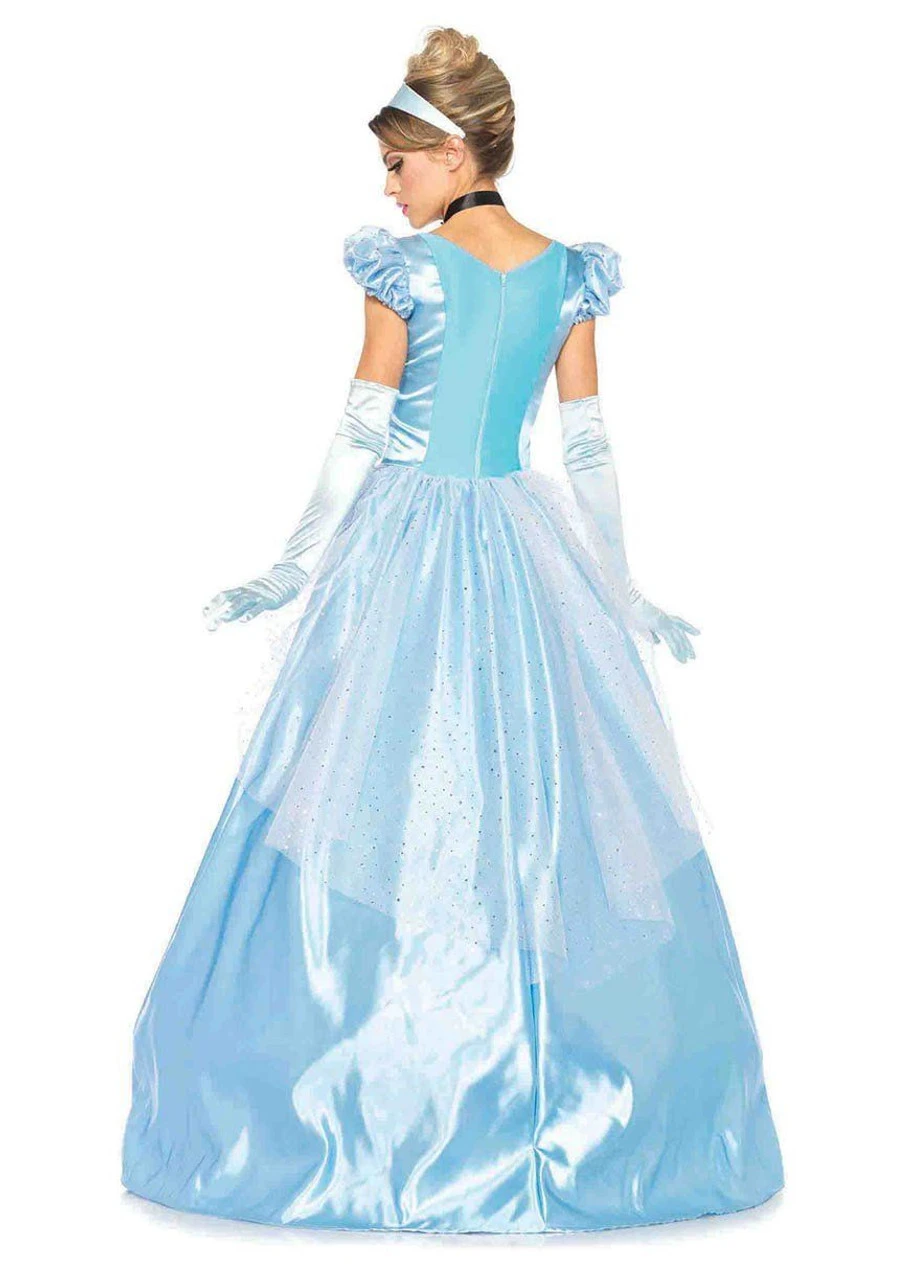 3 piece classic Cinderella, includes long satin ball gown with glitter tulle accents, satin choker, and matching headband.