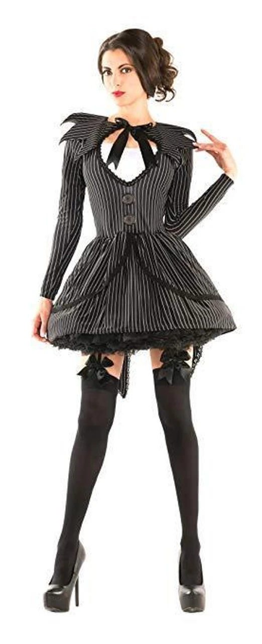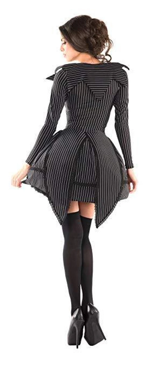 Having bad dreams has never looked this good in this sizzling Bad Dreams Babe women’s costume from Party King. This high quality costume feature a pin-striped dress with pointy collar, black buttons and bow details. Costume features built-in coat tails with black lace trim and long sleeves.