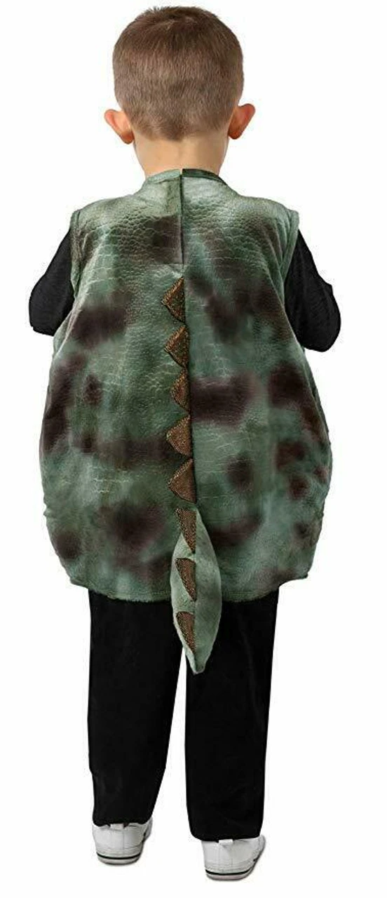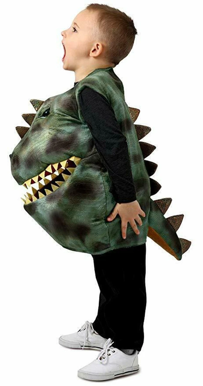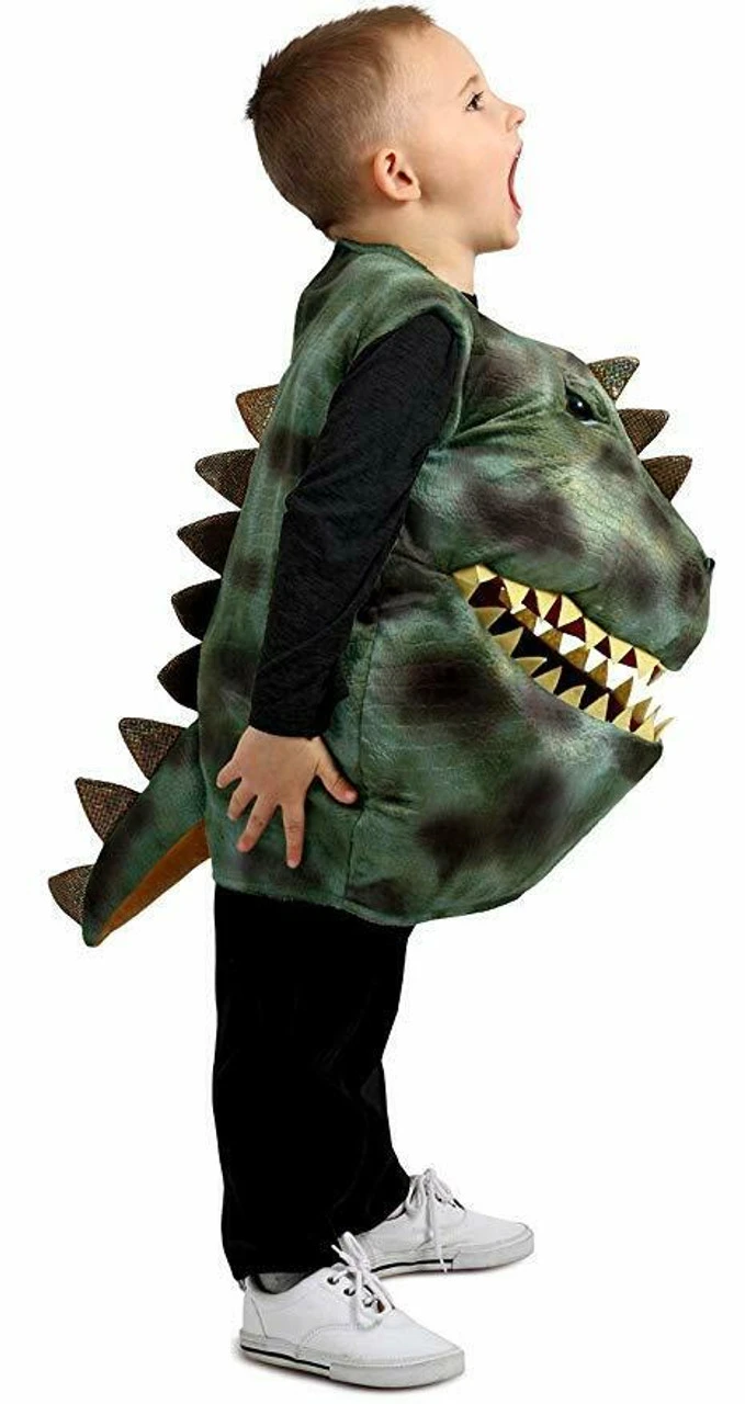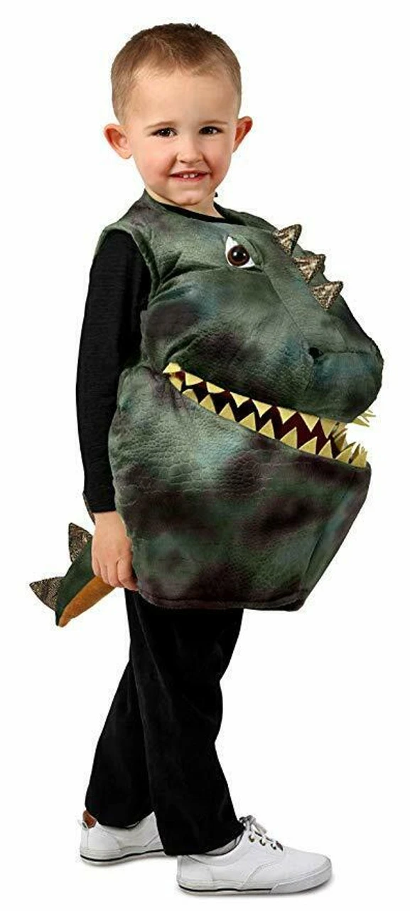 Clear the way for this hungry dinosaur! They’ll have a safe place to keep their belongings in this Feed Me Dino costume. Sleeveless green patterned bodysuit in the shape of a dinosaur head with attached stuffed tail in back; open mouth-pouch in front for them to store candy, toys, treasures or whatever else they desire. Dino mouth features yellow felt teeth menacingly framing the opening with red-lined inner. No one will want to steal anything from their pocket with this dinosaur guarding their goods.
