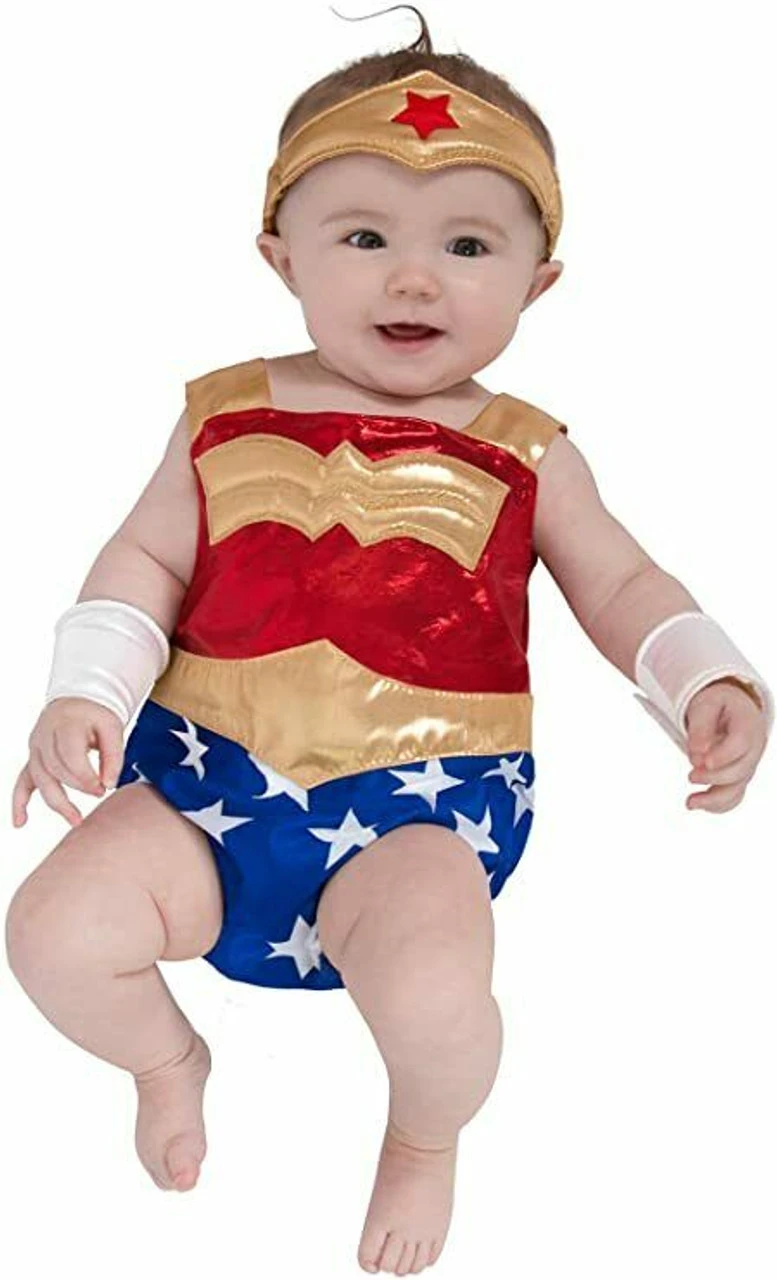 Includes: Sleeveless onesie with gold straps, red shimmer top with gold Wonder Woman logo, gold belted waist and blue bottoms half with white stars; gold headband with red star in center; wrist cuffs with velcro-style closure, and boot-covers