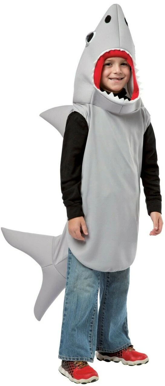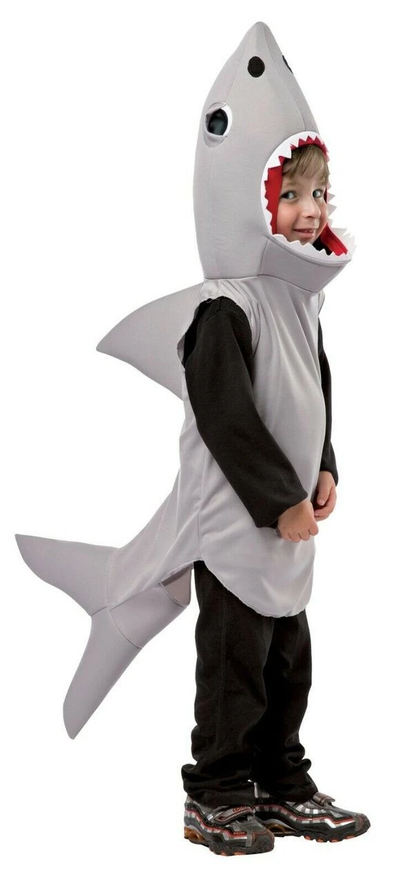 Look just like the most fearsome creature in the sea with this fun costume! Light gray polyfoam tunic has a dorsal fin on the back and a tail fin at the bottom. Your face is in the mouth opening rimmed with white jagged teeth. Good visibility! Just put on over your own clothes for a comfortable and easy costume with lots of impact!
