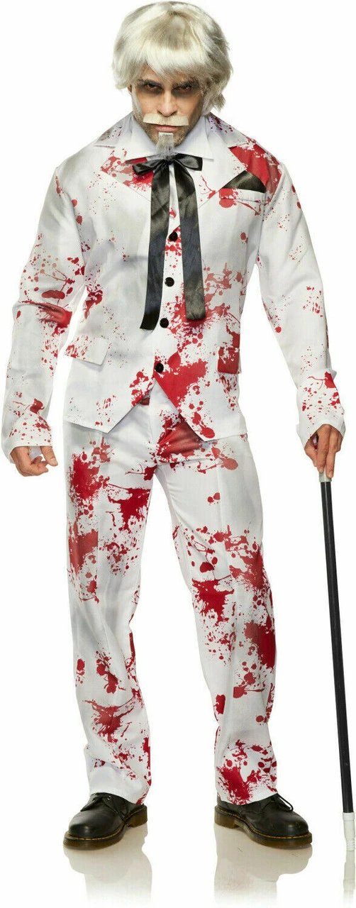 COSTUME INCLUDES: White suit jacket with red blood splatters, button front closure, faux pockets and an attached black pocket square. To complete the look, also included is a pair of white blood splattered pants and a black satin neck tie.