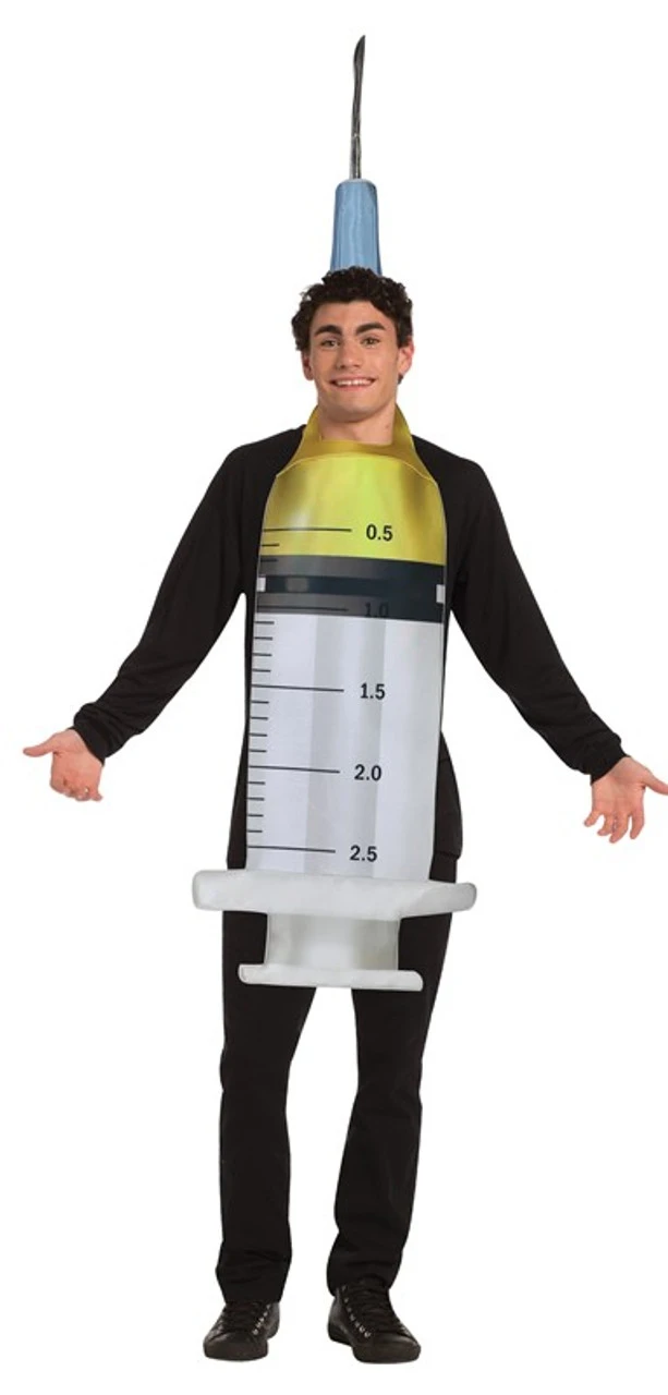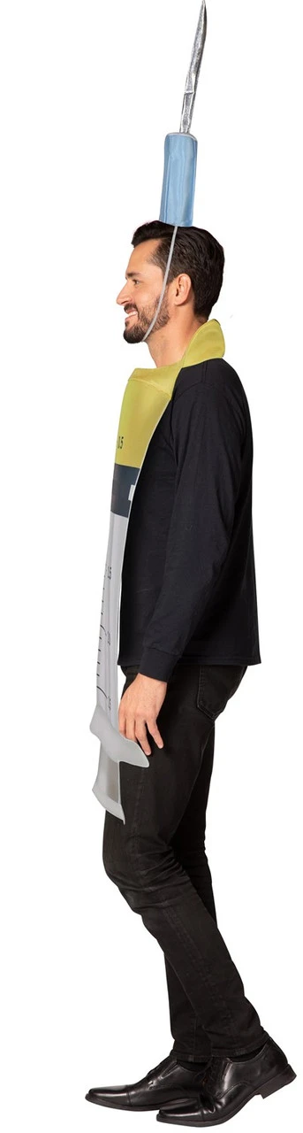 It’s worth a shot to be the funniest one in the room wearing this Syringe Needle Costume! This costume includes a tunic and a headpiece. The syringe barrel pulls over the head as a hanging syringe which lays over the front of your clothing. It is printed with hash marks on the front only. The needle headpiece can be filled with stuffing for added support and includes a secured elastic band that fits under the chin. One Size fits most adults.